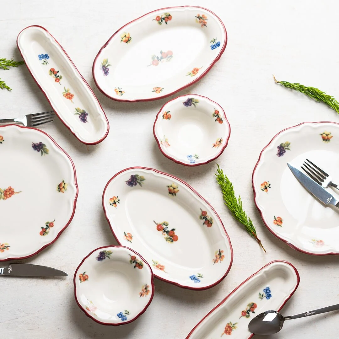 Estetik ve Fonksiyonellik Harmanı: Bu set, 6 adet 22 cm düz tabak, 4 adet 12 cm reçellik, 2 adet 23 cm zeytinlik ve 2 adet 21 cm oval kayıktan oluşur. Her parça, zarif doğa ve yeşillik desenleriyle süslenmiştir, sofranıza doğanın tazeliğini ve huzurunu getirir.
